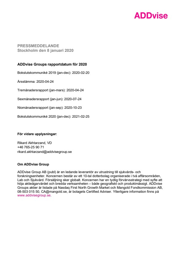 ADDvise Group AB (publ) är en ledande leverantör av utrustning till sjukvårds- och forskningsenheter. Koncernen består av ett 10-tal dotterbolag organiserade i två affärsområden, Lab och Sjukvård. Försäljning sker globalt. Koncernen har en tydlig förvärvsstrategi med syfte att höja aktieägarvärdet och bredda verksamheten – både geografiskt och produktmässigt. ADDvise Groups aktier är listade på Nasdaq First North Growth Market och Mangold Fondkommission AB, 08-503 015 50, CA@mangold.se, är bolagets Certified Adviser. Ytterligare information finns på www.addvisegroup.se.