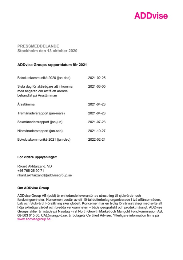 ADDvise Group AB (publ) är en ledande leverantör av utrustning till sjukvårds- och forskningsenheter. Koncernen består av ett 10-tal dotterbolag organiserade i två affärsområden, Lab och Sjukvård. Försäljning sker globalt. Koncernen har en tydlig förvärvsstrategi med syfte att höja aktieägarvärdet och bredda verksamheten – både geografiskt och produktmässigt. ADDvise Groups aktier är listade på Nasdaq First North Growth Market och Mangold Fondkommission AB, 08-503 015 50, CA@mangold.se, är bolagets Certified Adviser. Ytterligare information finns på www.addvisegroup.se.