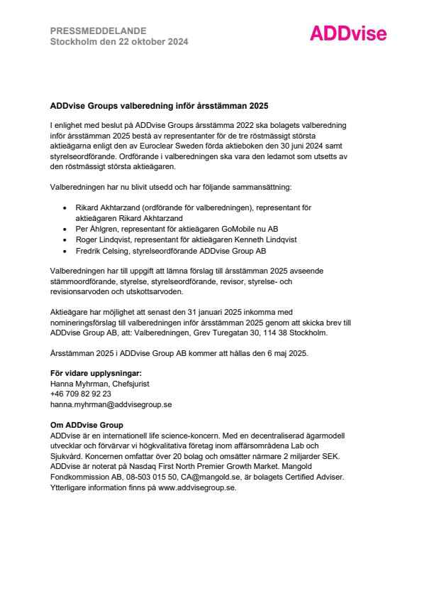Aktieägare har möjlighet att senast den 31 januari 2025 inkomma med nomineringsförslag till valberedningen inför årsstämman 2025 genom att skicka brev till ADDvise Group AB, att: Valberedningen, Grev Turegatan 30, 114 38 Stockholm.