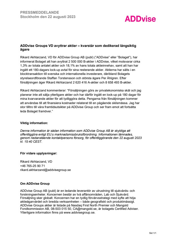 Rikard Akhtarzand, VD för ADDvise Group AB (publ) (”ADDvise” eller ”Bolaget”), har informerat Bolaget att han avyttrat 2 500 000 B-aktier i ADDvise, vilket motsvarar cirka 1,3% av totala antalet aktier och 18,1% av hans totala aktieinnehav, samt att han har ingått ett 180-dagars lock-up avtal för sina resterande aktier. Aktierna har sålts i en blocktransaktion till svenska och internationella investerare, däribland Bolagets styrelseordförande Staffan Torstensson och största ägare Per Åhlgren. Efter försäljningen äger Rikard Akhtarzand 2 620 416 A-aktier och 8 658 493 B-aktier.