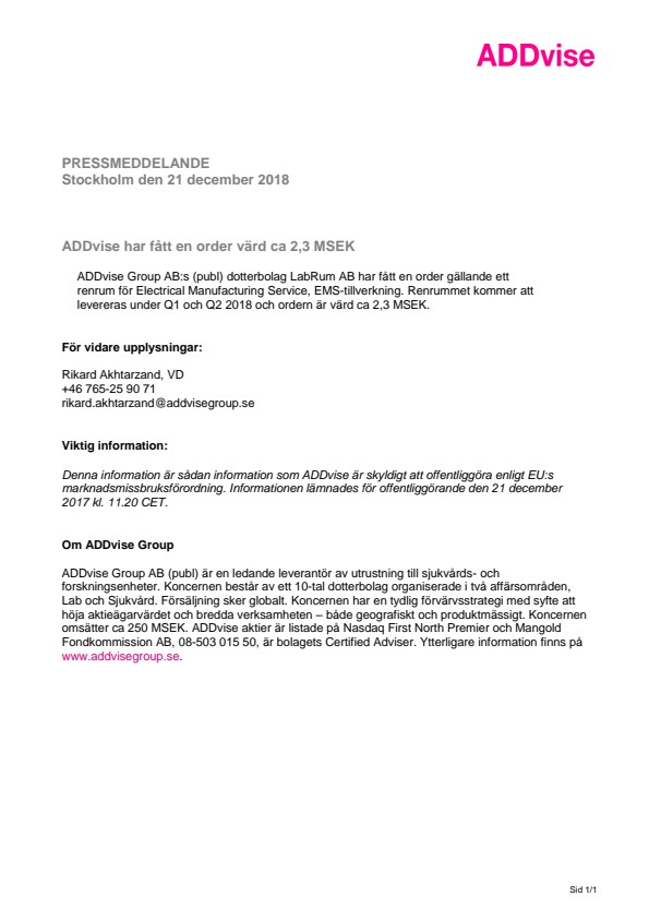 ADDvise Group AB:s (publ) dotterbolag LabRum AB har fått en order gällande ett renrum för Electrical Manufacturing Service, EMS-tillverkning. Renrummet kommer att levereras under Q1 och Q2 2018 och ordern är värd ca 2,3 MSEK.