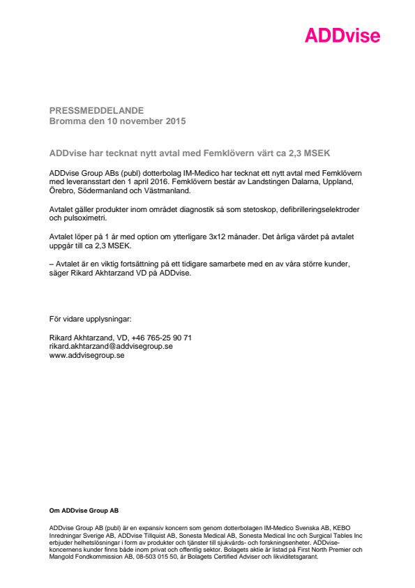 Rikard Akhtarzand, VD, +46 765-25 90 71 rikard.akhtarzand@addvisegroup.se www.addvisegroup.se
