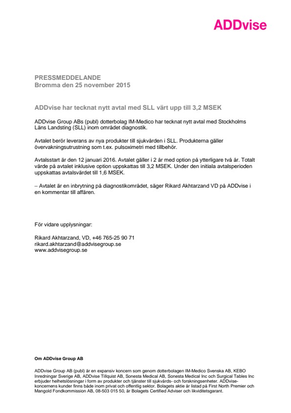 Rikard Akhtarzand, VD, +46 765-25 90 71 rikard.akhtarzand@addvisegroup.se www.addvisegroup.se