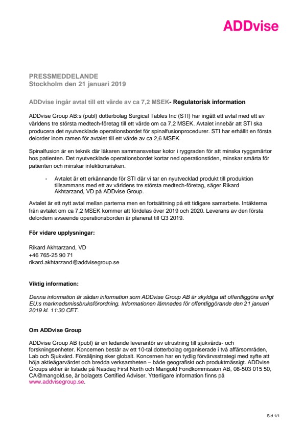 ADDvise Group AB:s (publ) dotterbolag Surgical Tables Inc (STI) har ingått ett avtal med ett av världens tre största medtech-företag till ett värde om ca 7,2 MSEK. Avtalet innebär att STI ska producera det nyutvecklade operationsbordet för spinalfusionprocedurer. STI har erhållit en första delorder inom ramen för avtalet till ett värde av ca 2,6 MSEK.