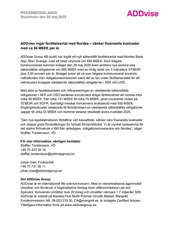 ADDvise Group AB (publ) har ingått ett nytt säkerställt facilitetsavtal med Nordea Bank Abp, filial i Sverige, med ett totalt utrymme om 450 MSEK. Som tidigare kommunicerats kommer bolaget den 28 maj 2025 även emittera nya seniora icke säkerställda obligationer om 800 MSEK med en rörlig ränta om 3 månaders STIBOR plus 3,50 procent per år. Bolaget avser att så som tidigare kommunicerat använda nettolikviden från obligationsemissionen samt del av lån under facilitetsavtalet för att refinansiera bolagets utestående säkerställda obligationer i SEK och USD.