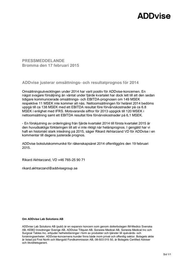 – En förskjutning av orderingång från fjärde kvartalet 2014 till första kvartalet 2015 är den huvudsakliga förklaringen till att vi inte riktigt når helårsprognos. I gengäld har vi haft en historiskt stark inledning på 2015, säger Rikard Akhtarzand VD för ADDvise i en kommentar till dagens justerade prognos.