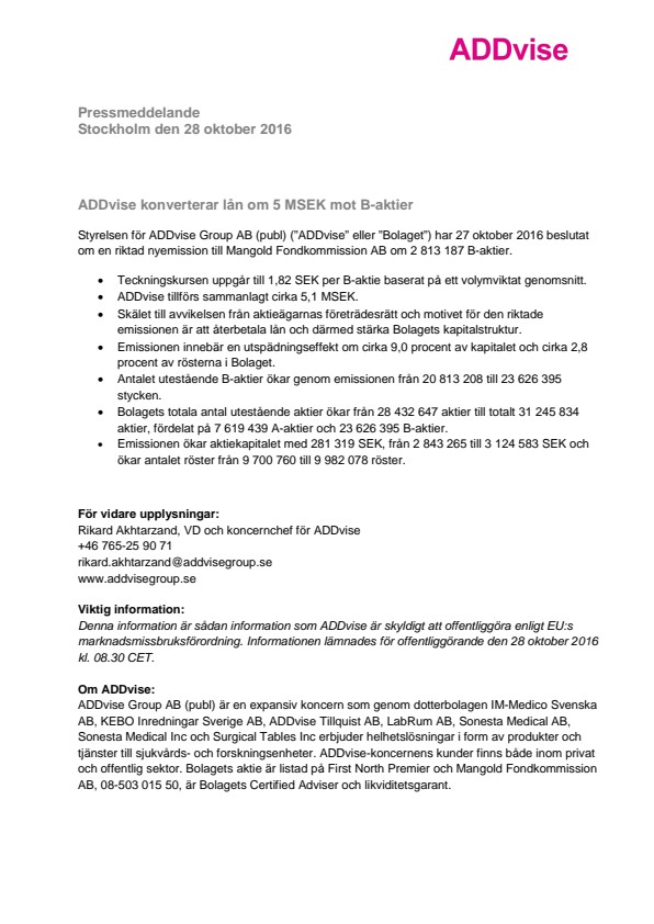ADDvise konverterar lån om 5 MSEK mot B-aktier