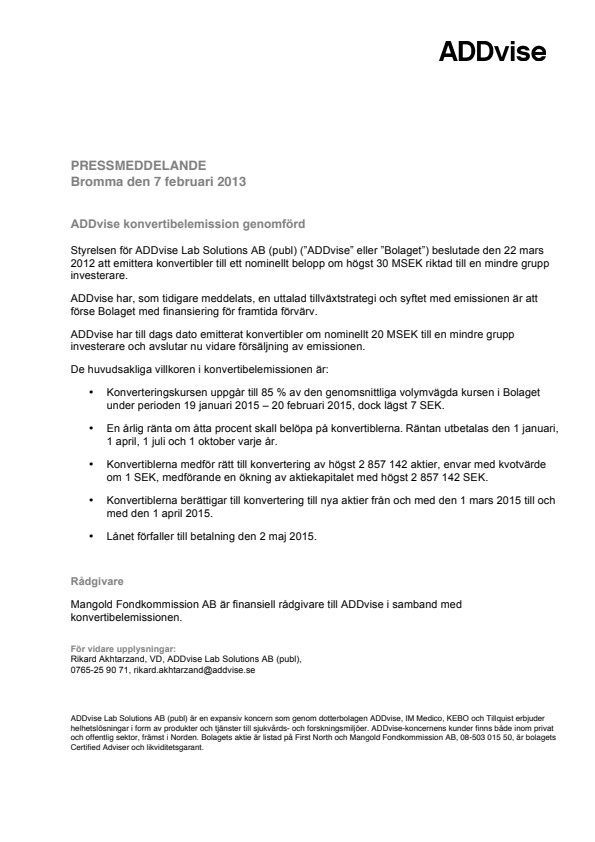 Mangold Fondkommission AB är finansiell rådgivare till ADDvise i samband med konvertibelemissionen.