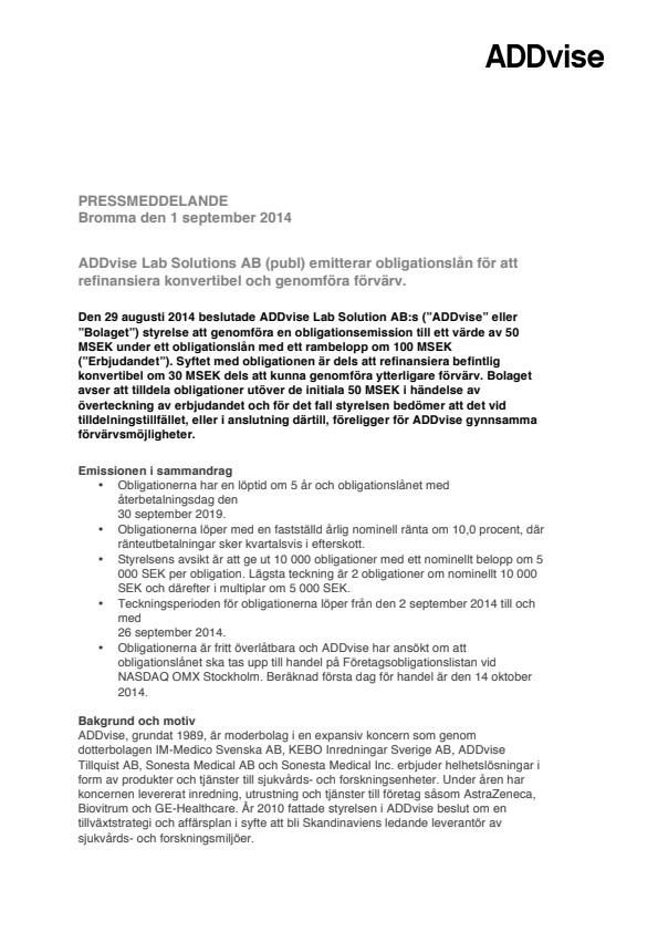 ADDvise Lab Solutions AB (publ) emitterar obligationslån för att refinansiera konvertibel och genomföra förvärv.
