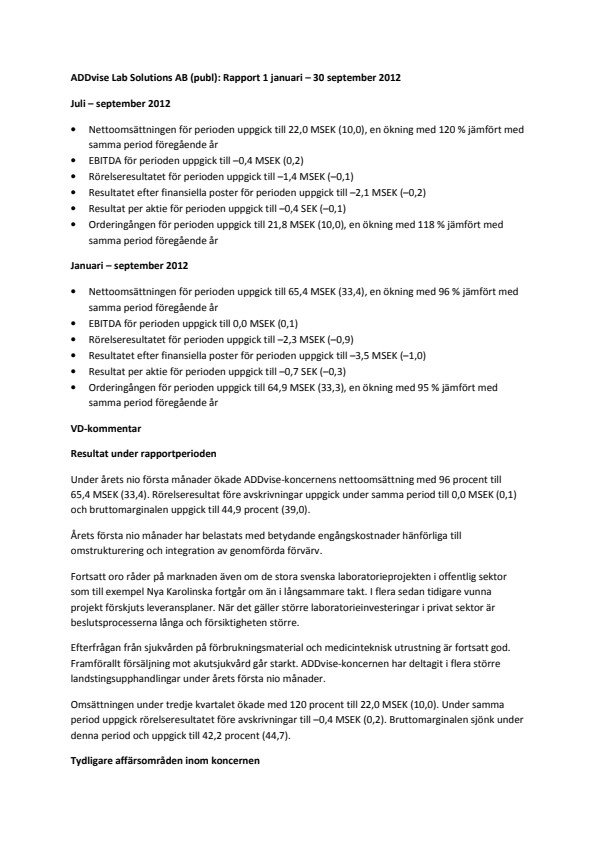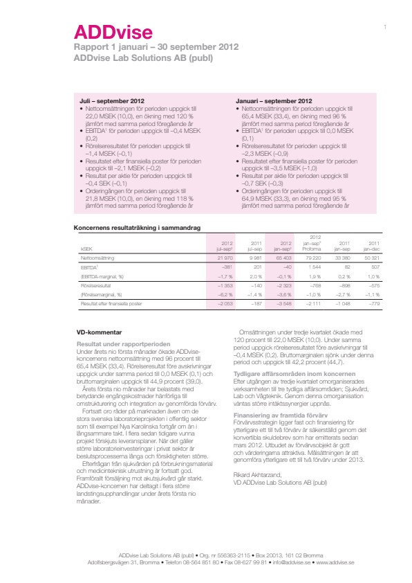 ADDvise Lab Solutions AB (publ): Rapport 1 januari – 30 september 2012