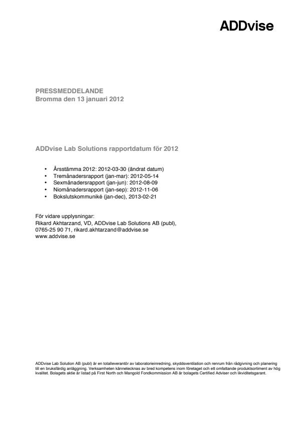 ADDvise Lab Solutions rapportdatum för 2012