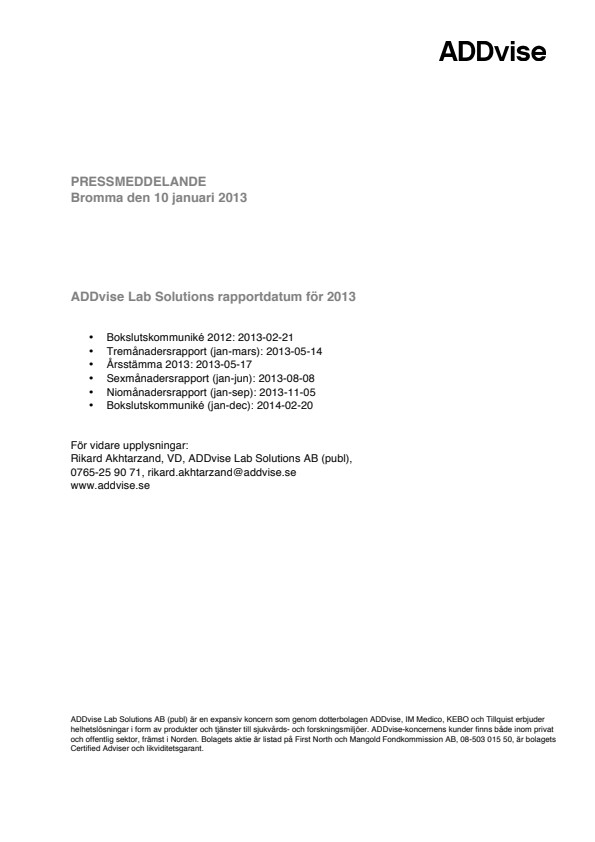 Rikard Akhtarzand, VD, ADDvise Lab Solutions AB (publ), 0765-25 90 71, rikard.akhtarzand@addvise.se www.addvise.se