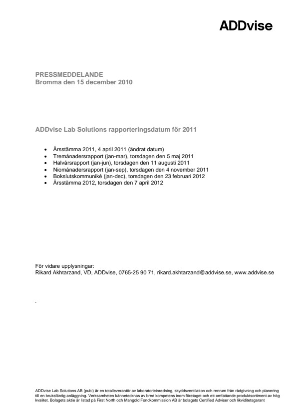 ADDVISE LAB SOLUTIONS RAPPORTERINGSDATUM FÖR 2011