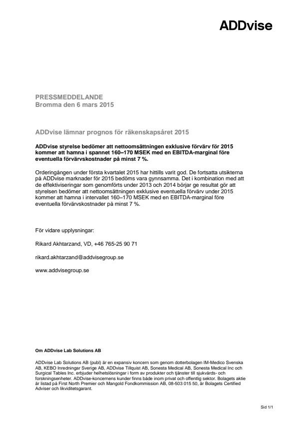 Orderingången under första kvartalet 2015 har hittills varit god. De fortsatta utsikterna på ADDvise marknader för 2015 bedöms vara gynnsamma. Det i kombination med att de effektiviseringar som genomförts under 2013 och 2014 börjar ge resultat gör att styrelsen bedömer att nettoomsättningen exklusive eventuella förvärv under 2015 kommer att hamna i intervallet 160–170 MSEK med en EBITDA-marginal före eventuella förvärvskostnader på minst 7 %.