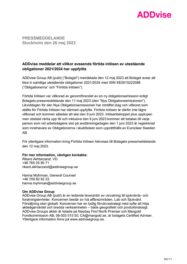 ADDvise Group AB (publ) (”Bolaget”) meddelade den 12 maj 2023 att Bolaget avser att lösa in samtliga utestående obligationer 2021/2024 med ISIN SE0015222088 (”Obligationerna” och ”Förtida Inlösen”).