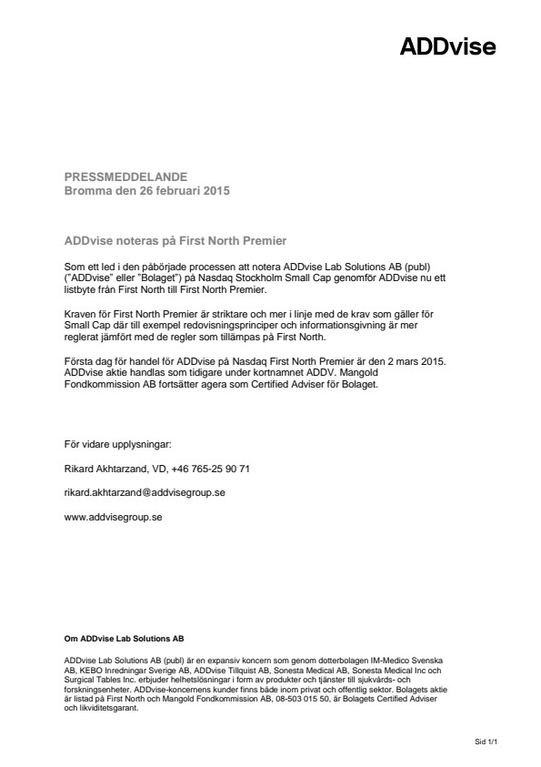 Första dag för handel för ADDvise på Nasdaq First North Premier är den 2 mars 2015. ADDvise aktie handlas som tidigare under kortnamnet ADDV. Mangold Fondkommission AB fortsätter agera som Certified Adviser för Bolaget.