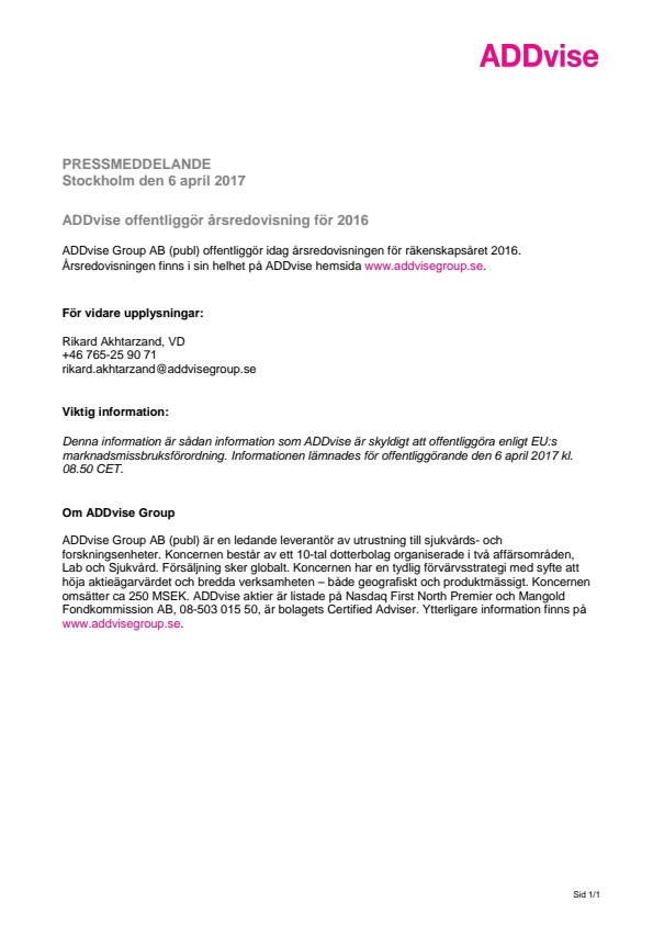 ADDvise Group AB (publ) offentliggör idag årsredovisningen för räkenskapsåret 2016. Årsredovisningen finns i sin helhet på ADDvise hemsida www.addvisegroup.se.