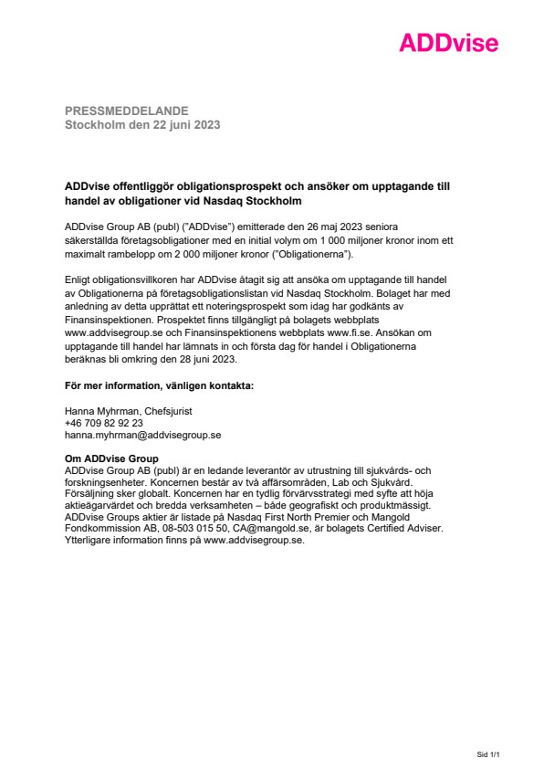 Enligt obligationsvillkoren har ADDvise åtagit sig att ansöka om upptagande till handel av Obligationerna på företagsobligationslistan vid Nasdaq Stockholm. Bolaget har med anledning av detta upprättat ett noteringsprospekt som idag har godkänts av Finansinspektionen. Prospektet finns tillgängligt på bolagets webbplats www.addvisegroup.se och Finansinspektionens webbplats www.fi.se. Ansökan om upptagande till handel har lämnats in och första dag för handel i Obligationerna beräknas bli omkring den 28 juni 2023.