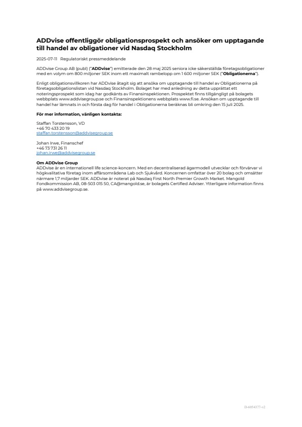 Enligt obligationsvillkoren har ADDvise åtagit sig att ansöka om upptagande till handel av Obligationerna på företagsobligationslistan vid Nasdaq Stockholm. Bolaget har med anledning av detta upprättat ett noteringsprospekt som idag har godkänts av Finansinspektionen. Prospektet finns tillgängligt på bolagets webbplats www.addvisegroup.se och Finansinspektionens webbplats www.fi.se. Ansökan om upptagande till handel har lämnats in och första dag för handel i Obligationerna beräknas bli omkring den 15 juli 2025.