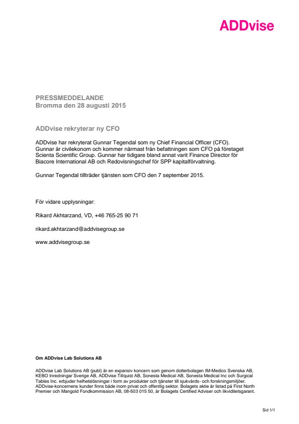 ADDvise Lab Solutions AB (publ) är en expansiv koncern som genom dotterbolagen IM-Medico Svenska AB, KEBO Inredningar Sverige AB, ADDvise Tillquist AB, Sonesta Medical AB, Sonesta Medical Inc och Surgical Tables Inc. erbjuder helhetslösningar i form av produkter och tjänster till sjukvårds- och forskningsmiljöer. ADDvise-koncernens kunder finns både inom privat och offentlig sektor. Bolagets aktie är listad på First North Premier och Mangold Fondkommission AB, 08-503 015 50, är Bolagets Certified Adviser och likviditetsgarant.