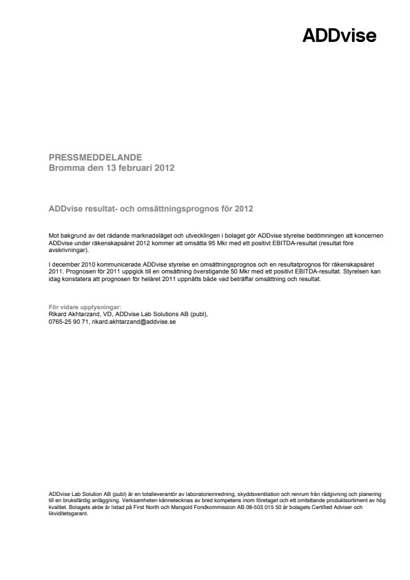 ADDvise resultat- och omsättningsprognos för 2012