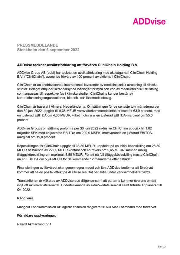 ADDvise Groups omsättning proforma per 30 juni 2022 inklusive CliniChain uppgick till 1,02 miljarder SEK med en justerad EBITDA om 200,9 MSEK, motsvarande en justerad EBITDA-marginal om 19,8 procent.