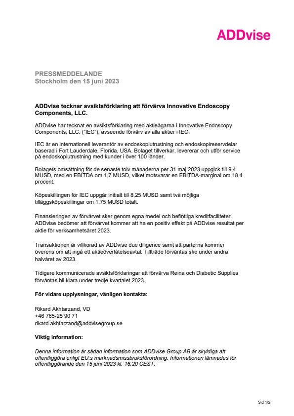 ADDvise har tecknat en avsiktsförklaring med aktieägarna i Innovative Endoscopy Components, LLC. (”IEC”), avseende förvärv av alla aktier i IEC.