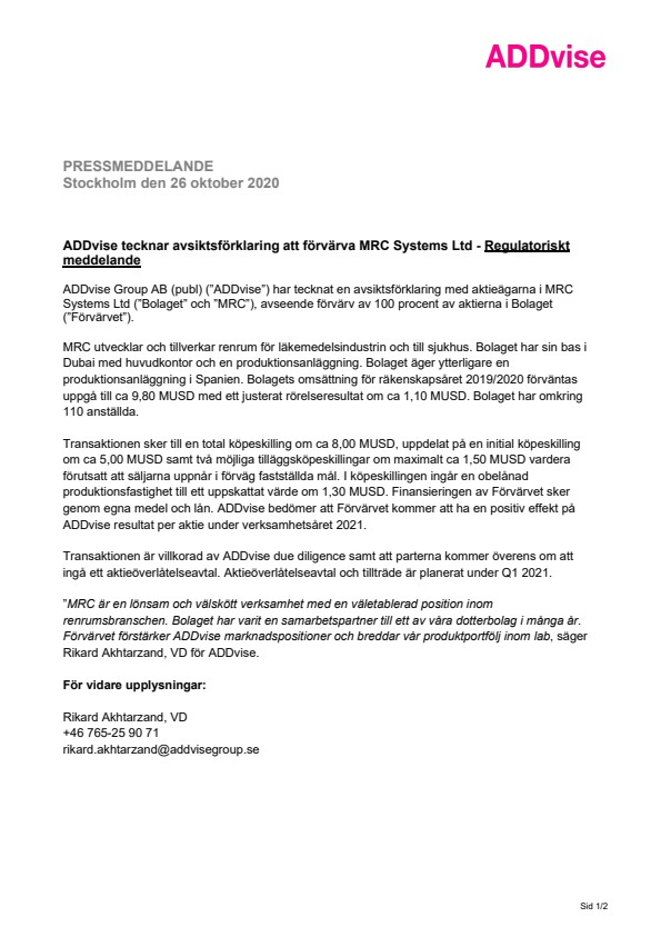 ADDvise Group AB (publ) (”ADDvise”) har tecknat en avsiktsförklaring med aktieägarna i MRC Systems Ltd (”Bolaget” och ”MRC”), avseende förvärv av 100 procent av aktierna i Bolaget (”Förvärvet”).