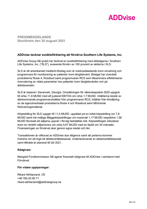 ADDvise Group AB (publ) har tecknat en avsiktsförklaring med aktieägarna i Southern Life Systems, Inc. (”SLS”), avseende förvärv av 100 procent av aktierna i SLS.
