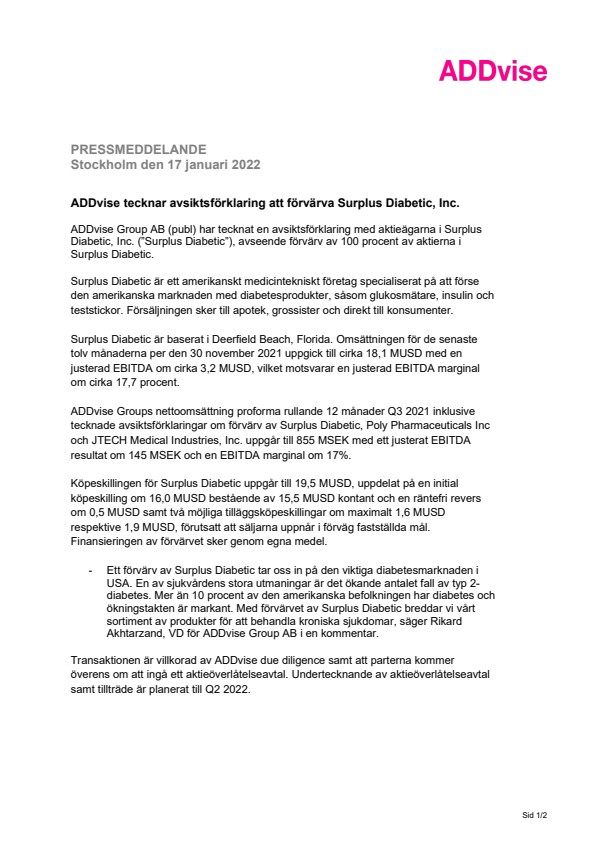 ADDvise Group AB (publ) har tecknat en avsiktsförklaring med aktieägarna i Surplus Diabetic, Inc. (”Surplus Diabetic”), avseende förvärv av 100 procent av aktierna i Surplus Diabetic.