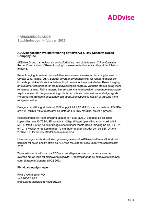 ADDvise Group har tecknat en avsiktsförklaring med aktieägaren i X-Ray Cassette Repair Company Inc. (”Reina Imaging”), avseende förvärv av samtliga aktier i Reina Imaging.