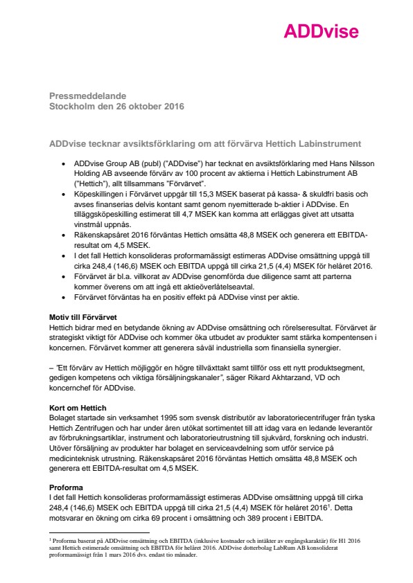 [1] Proforma baserat på ADDvise omsättning och EBITDA (inklusive kostnader och intäkter av engångskaraktär) för H1 2016 samt Hettich estimerade omsättning och EBITDA för helåret 2016. ADDvise dotterbolag LabRum AB konsoliderat proformamässigt från 1 mars 2016 dvs. endast tio månader.