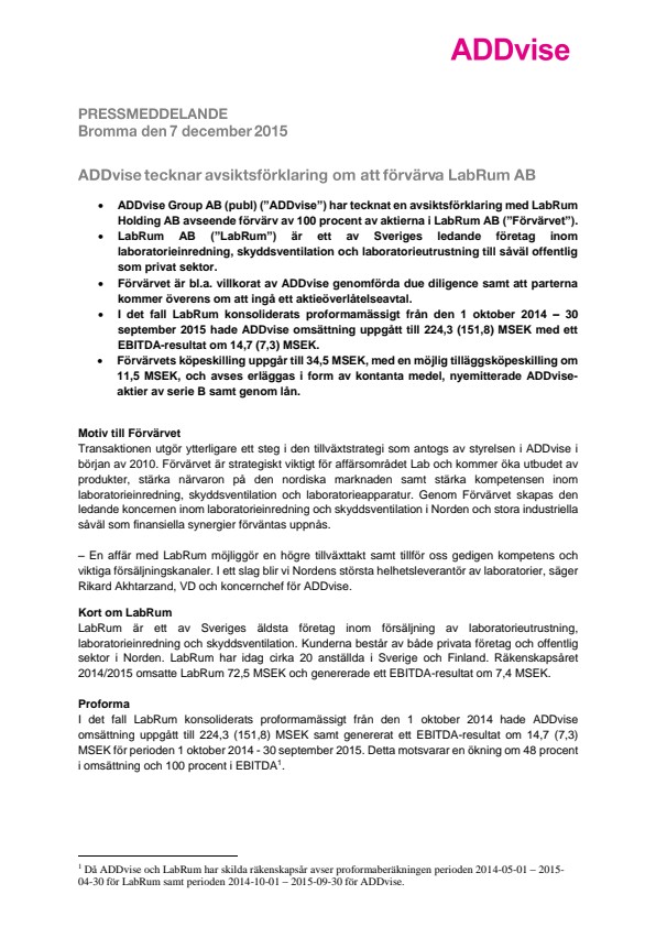 [1] Då ADDvise och LabRum har skilda räkenskapsår avser proformaberäkningen perioden 2014-05-01 – 2015-04-30 för LabRum samt perioden 2014-10-01 – 2015-09-30 för ADDvise.