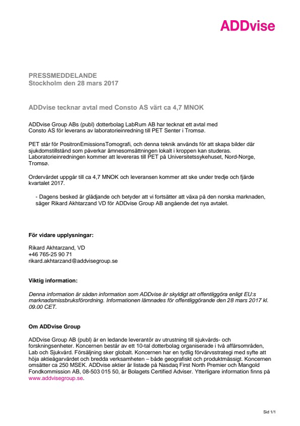 Denna information är sådan information som ADDvise är skyldigt att offentliggöra enligt EU:s marknadsmissbruksförordning. Informationen lämnades för offentliggörande den 28 mars 2017 kl. 09.00 CET.