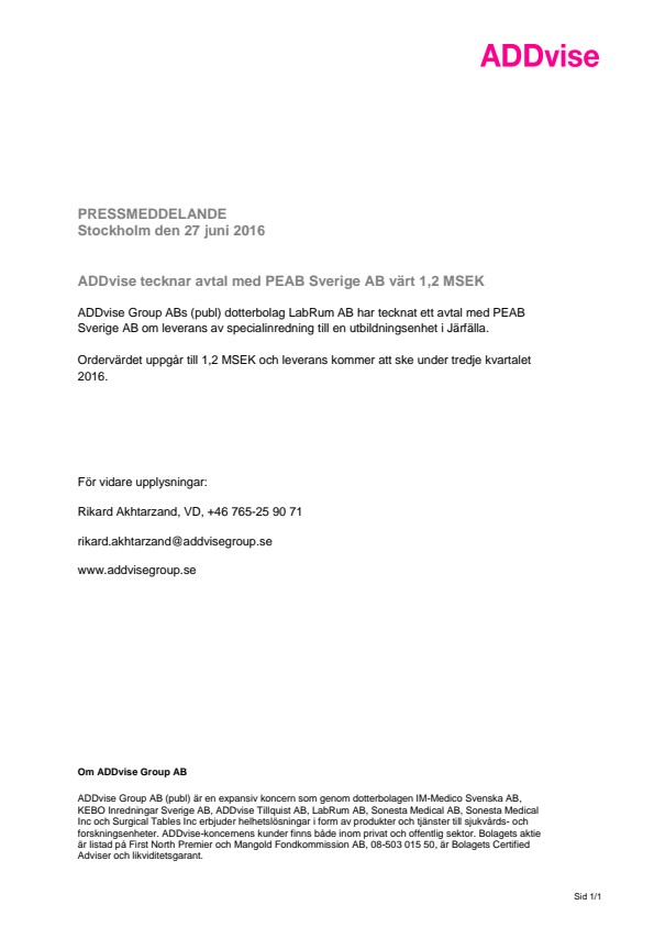 ADDvise Group AB (publ) är en expansiv koncern som genom dotterbolagen IM-Medico Svenska AB, KEBO Inredningar Sverige AB, ADDvise Tillquist AB, LabRum AB, Sonesta Medical AB, Sonesta Medical Inc och Surgical Tables Inc erbjuder helhetslösningar i form av produkter och tjänster till sjukvårds- och forskningsenheter. ADDvise-koncernens kunder finns både inom privat och offentlig sektor. Bolagets aktie är listad på First North Premier och Mangold Fondkommission AB, 08-503 015 50, är Bolagets Certified Adviser och likviditetsgarant.