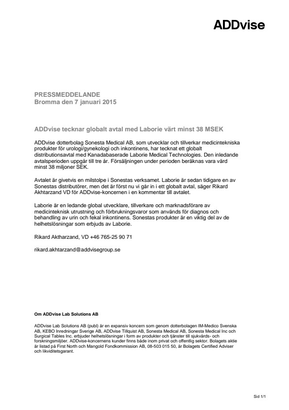 Avtalet är givetvis en milstolpe i Sonestas verksamet. Laborie är sedan tidigare en av Sonestas distributörer, men det är först nu vi går in i ett globalt avtal, säger Rikard Akhtarzand VD för ADDvise-koncernen i en kommentar till avtalet.