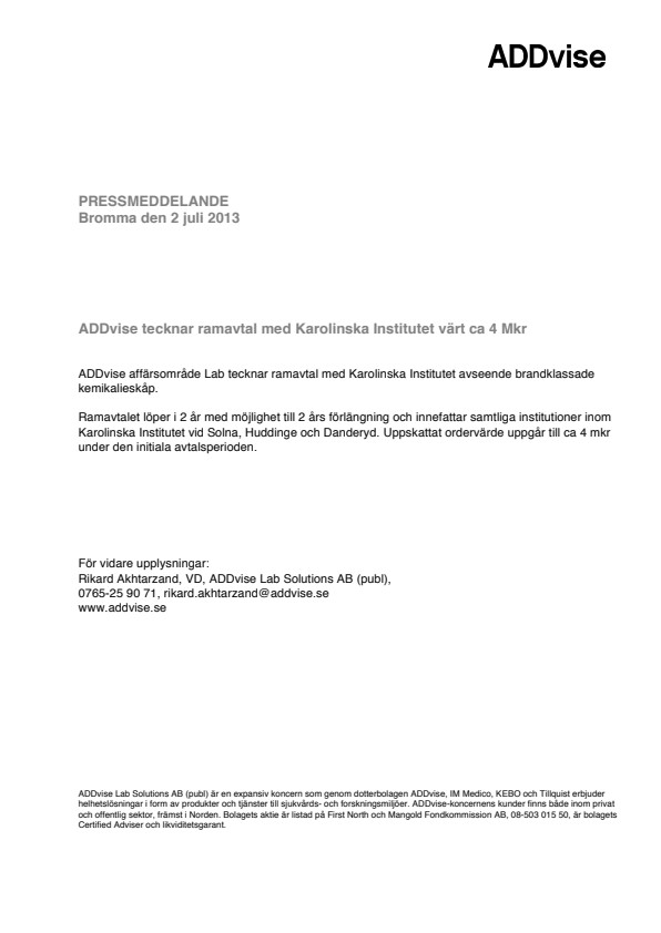 ADDvise Lab Solutions AB (publ) är en expansiv koncern som genom dotterbolagen ADDvise, IM Medico, KEBO och Tillquist erbjuder helhetslösningar i form av produkter och tjänster till sjukvårds- och forskningsmiljöer. ADDvise-koncernens kunder finns både inom privat och offentlig sektor, främst i Norden. Bolagets aktie är listad på First North och Mangold Fondkommission AB, 08-503 015 50, är bolagets Certified Adviser och likviditetsgarant.