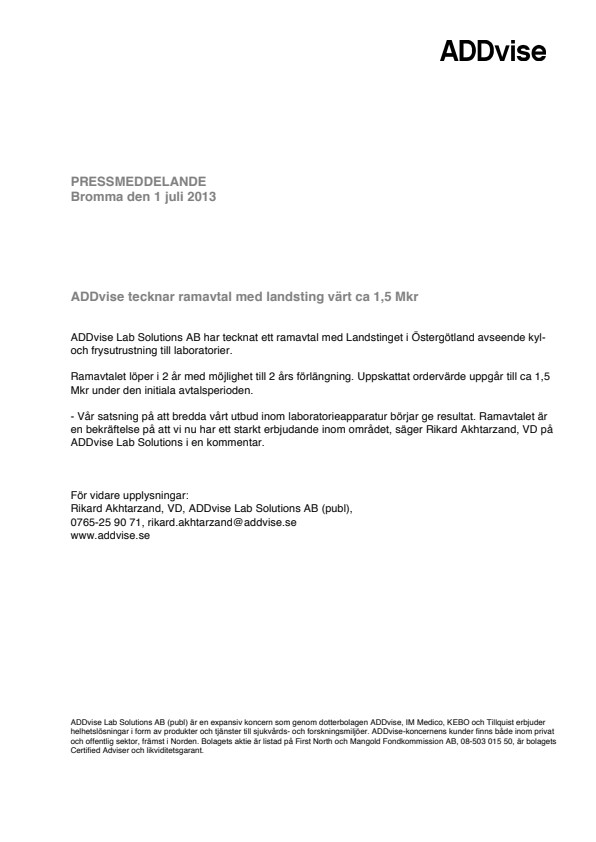 – Vår satsning på att bredda vårt utbud inom laboratorieapparatur börjar ge resultat. Ramavtalet är en bekräftelse på att vi nu har ett starkt erbjudande inom området, säger Rikard Akhtarzand, VD på ADDvise Lab Solutions i en kommentar.