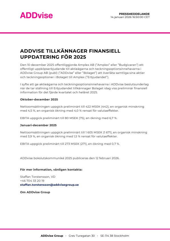 Den 10 december 2025 offentliggjorde Amplex AB (”Amplex” eller ”Budgivaren”) ett offentligt uppköpserbjudande till aktieägarna och teckningsoptionsinnehavarna i ADDvise Group AB (publ) (”ADDvise” eller ”Bolaget”) att överlåta samtliga sina aktier och teckningsoptioner i Bolaget till Amplex (”Erbjudandet”).