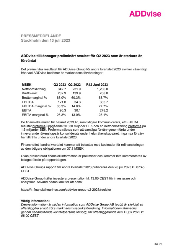 Denna information är sådan information som ADDvise Group AB (publ) är skyldigt att offentliggöra enligt EU:s marknadsmissbruksförordning. Informationen lämnades, genom nedanstående kontaktpersons försorg, för offentliggörande den 13 juli 2023 kl. 08:00 CEST.