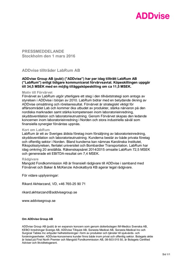 ADDvise tillträder LabRum AB