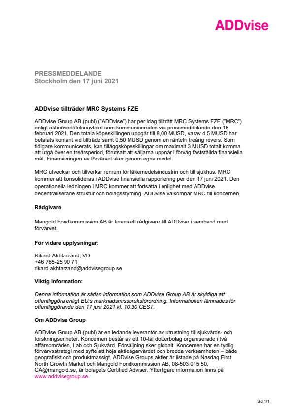 ADDvise Group AB (publ) (”ADDvise”) har per idag tillträtt MRC Systems FZE (”MRC”) enligt aktieöverlåtelseavtalet som kommunicerades via pressmeddelande den 16 februari 2021. Den totala köpeskillingen uppgår till 8,00 MUSD, varav 4,5 MUSD har betalats kontant vid tillträde samt 0,50 MUSD genom en räntefri treårig revers. Som tidigare kommunicerats, kan tilläggsköpeskillingar om maximalt 3 MUSD totalt komma att utgå över en treårsperiod, förutsatt att säljarna uppnår i förväg fastställda finansiella mål. Finansieringen av förvärvet sker genom egna medel.