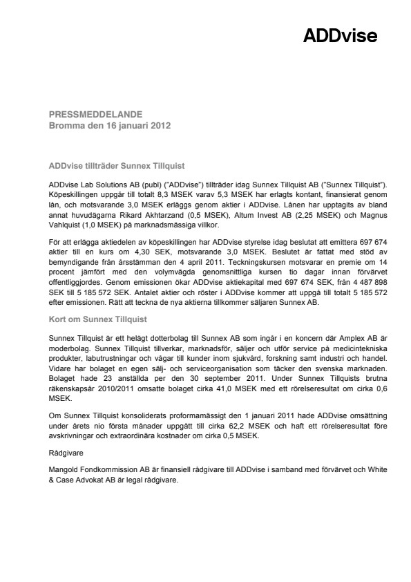 Mangold Fondkommission AB är finansiell rådgivare till ADDvise i samband med förvärvet och White & Case Advokat AB är legal rådgivare.