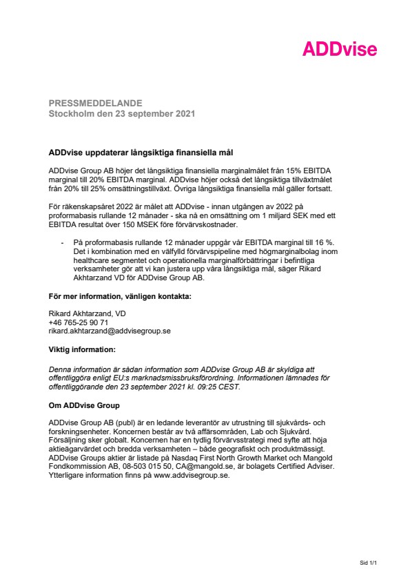 Denna information är sådan information som ADDvise Group AB är skyldiga att offentliggöra enligt EU:s marknadsmissbruksförordning. Informationen lämnades för offentliggörande den 23 september 2021 kl. 09:25 CEST.