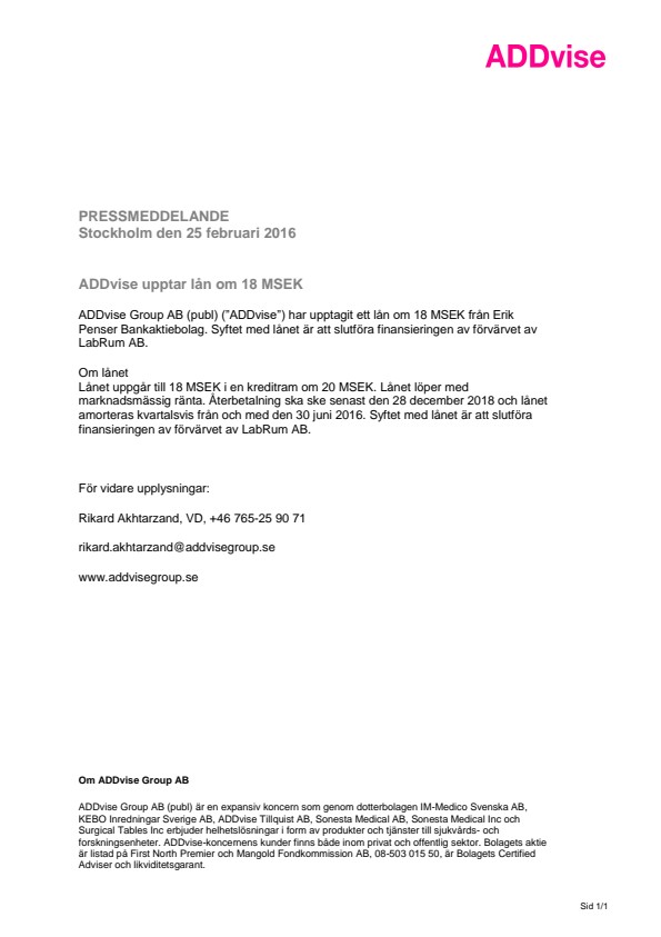 ADDvise Group AB (publ) är en expansiv koncern som genom dotterbolagen IM-Medico Svenska AB, KEBO Inredningar Sverige AB, ADDvise Tillquist AB, Sonesta Medical AB, Sonesta Medical Inc och Surgical Tables Inc erbjuder helhetslösningar i form av produkter och tjänster till sjukvårds- och forskningsenheter. ADDvise-koncernens kunder finns både inom privat och offentlig sektor. Bolagets aktie är listad på First North Premier och Mangold Fondkommission AB, 08-503 015 50, är Bolagets Certified Adviser och likviditetsgarant.