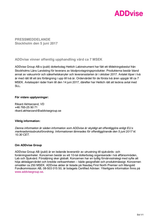 ADDvise Group AB:s (publ) dotterbolag Hettich Labinstrument har fått ett tilldelningsbeslut från Stockholms Läns Landsting för leverans av blodprovtagningsprodukter. Produkterna består bland annat av vakuumrör och säkerhetskanyler och leveransstarten är i oktober 2017. Avtalet löper i två år med rätt till ett års förlängning i upp till två år. Ordervärdet för de första två åren uppgår till ca 7 MSEK. Avtalsspärr råder fram till den 14 juni 2017, därefter har Hettich rätt att teckna avtal med SLL.