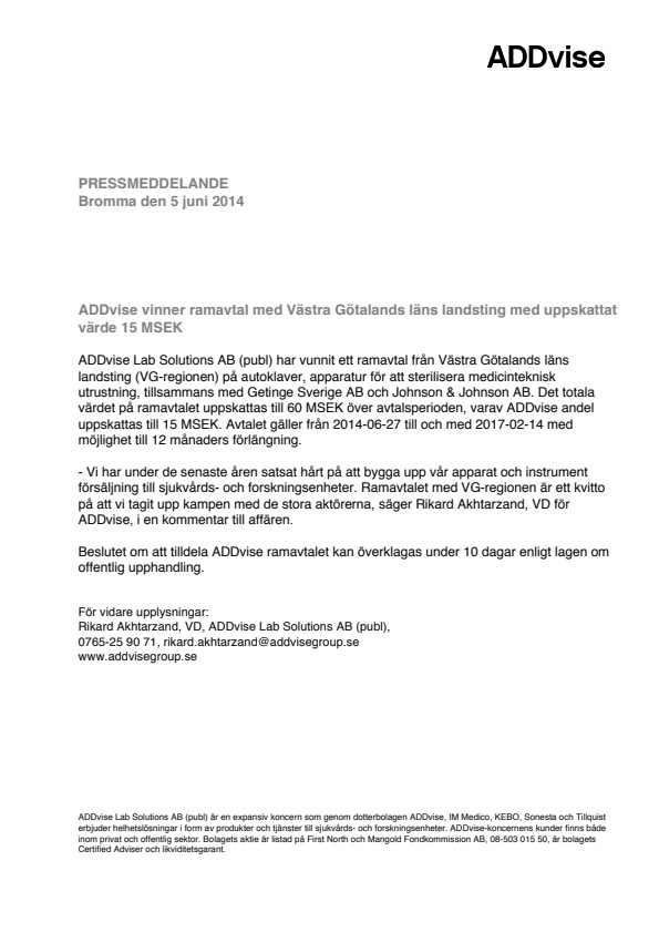 – Vi har under de senaste åren satsat hårt på att bygga upp vår apparat och instrument försäljning till sjukvårds- och forskningsenheter. Ramavtalet med VG-regionen är ett kvitto på att vi tagit upp kampen med de stora aktörerna, säger Rikard Akhtarzand, VD för ADDvise, i en kommentar till affären.