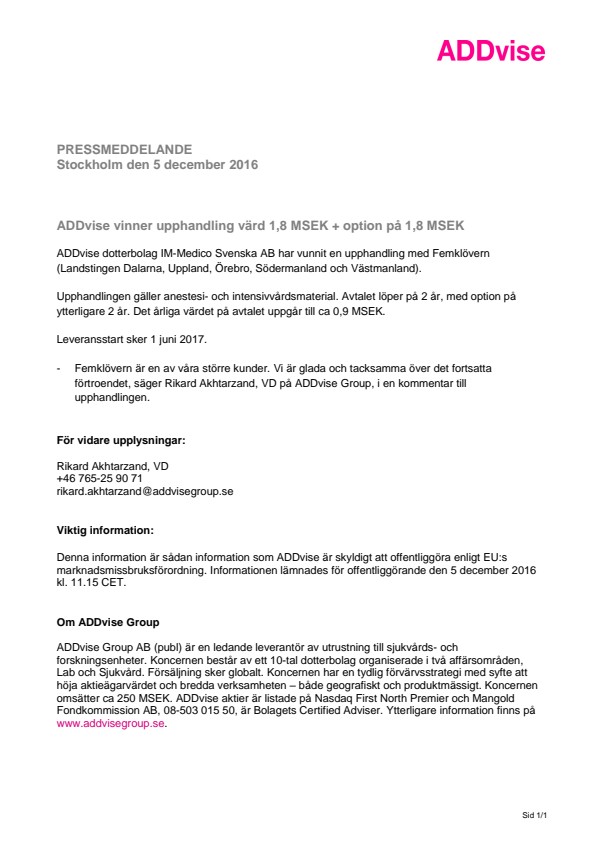 Denna information är sådan information som ADDvise är skyldigt att offentliggöra enligt EU:s marknadsmissbruksförordning. Informationen lämnades för offentliggörande den 5 december 2016 kl. 11.15 CET.