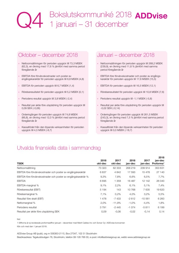 Denna information är sådan information som ADDvise är skyldigt att offentliggöra enligt EU:s marknadsmissbruksförordning samt lagen om värdepappersmarknaden. Informationen lämnades för offentliggörande den 21 februari 2019 kl. 08.45 CET.
