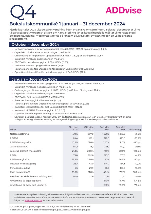 ADDvise finansiella rapporter finns tillgängliga på ADDvise hemsida, https://www.addvisegroup.se/investor-relations/finansiella-rapporter/